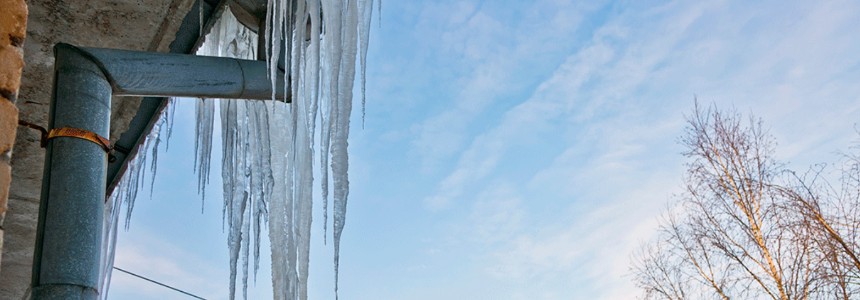 Schutz vor Frostschäden: Gefrorene Rinnen oder Fallrohre können aufplatzen oder sich verformen. Eine Dachrinnenheizung hält sie frei von Eis.